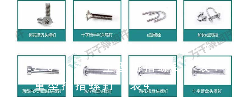 1.機螺釘 2.自攻螺釘 3.鉆尾螺釘 4.墻板釘 5.纖維板釘 6.木螺釘7.六角木螺釘 8.不脫出螺釘 9.組合螺釘 10.微型螺釘 11.家具螺釘 12.電子螺釘 頭型 :1.六角頭(hexagon head) 2.六角頭法蘭面(hexagon head