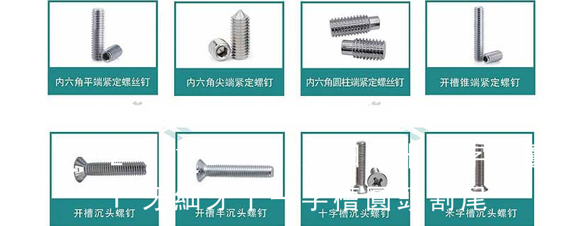 主要分類包括普通螺絲、機螺絲、自攻螺絲和膨脹螺絲三種。 有頭螺釘Cap screw 過去限于全牙的扣件。 六角頭螺釘Hex cap screw與大六角螺栓Hex bolt 顧名思義為頭部為六角型的外螺紋扣件,設計為使用扳手轉動。依照ASME B18.2.1標準,六