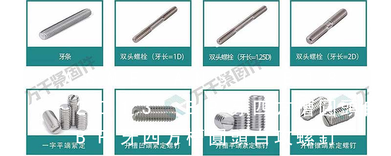外六角螺栓、內六角螺栓、馬車螺栓、膨脹螺栓、對鎖螺栓、U型螺栓、自攻螺釘、機械螺釘、緊定螺釘、螺柱、牙條、六角螺帽、尼龍螺帽、金屬鎖緊螺帽、四方螺帽、薄螺帽、蓋型螺帽、蝶型螺帽、法蘭面螺帽、鉚螺帽、圓螺帽、吊環 6. 木螺釘:也是與機器螺釘相似,但螺桿上的螺紋為專用的木螺釘用羅紋,可以直接旋入木質構件(或零件)中,用于把一個帶通孔的金屬(或非金屬)零件與一個木質構件緊固連接在一起。這種連接也是屬于可以拆卸連接。7. 墊圈