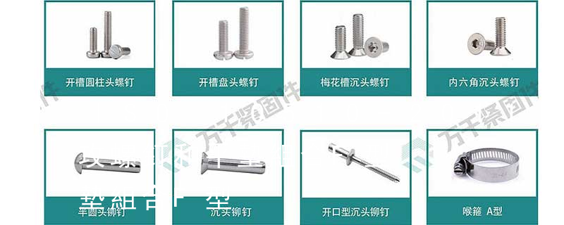 精密類:盤頭自攻釘、沉頭自攻釘、大扁頭自攻釘、盤頭機螺絲、沉頭機螺絲、大扁頭機螺絲、鉆尾螺釘、六角木螺釘、三角牙自攻釘、各種組合螺絲等 其它類:焊釘、拉鉚釘、牙棒、化學錨栓、鋼絲螺套、進口喉箍、開口銷、自鎖螺